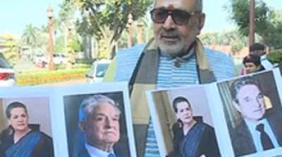 गिरिराज सिंह ने संसद परिसर में सोनिया और सोरेस का पोस्टर लहराया