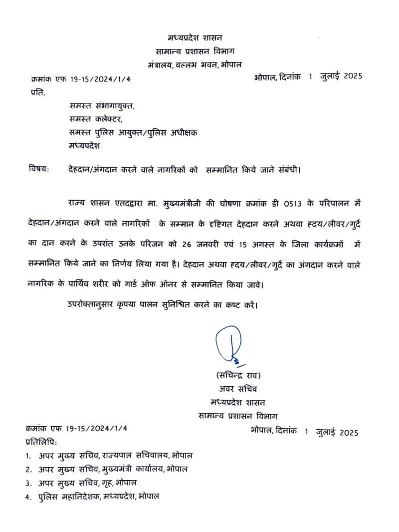 अंगदान करने वालों को गार्ड ऑफ ऑनर देने की घोषणा मुख्यमंत्री डॉ. मोहन यादव फरवरी 2025 में ही कर चुके थे, लेकिन अब इसका आदेश जारी होने के बाद सीएम ने अपने एक्स एकाउंट से एक ट्वीट किया है, जिसमें लिखा है कि मृत्यु के बाद जीवन का उपहार देना. यह केवल दान नहीं, अमरता है.