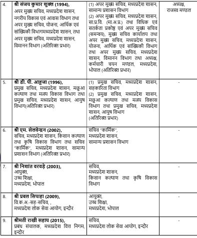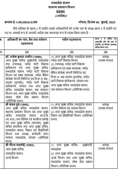 अन्य प्रमुख तबादले इस प्रकार हैं: संजय दुबे – बने अपर मुख्य सचिव, नगरीय विकास एवं आवास विभाग, संजय कुमार शुक्ल – नियुक्त अपर मुख्य सचिव, सामान्य प्रशासन विभाग (GAD), राखी सहाय – बनीं मध्यप्रदेश लोक सेवा आयोग (MPPSC) की नई सचिव, डीपी आहूजा – नियुक्त प्रमुख सचिव , सहकारिता विभाग , एम.सेलवेन्द्रन – बने सचिव, कार्मिक एवं सामान्य प्रशासन विभाग , निशांत वरवड़े – नियुक्त सचिव कृषि विभाग , प्रबल सिपाहा – बने आयुक्त, उच्च शिक्षा विभाग