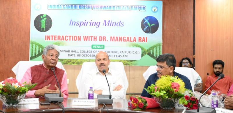 रायपुर : इंदिरा गांधी कृषि विश्वविद्यालय, रायपुर द्वारा आज कृषि महाविद्यालय के सेमिनार हॉल में ‘डॉ. मंगला राय से संवाद’ नामक एक प्रेरणादायक सत्र आयोजित किया गया। जिसमें भारतीय कृषि अनुसंधान परिषद नई दिल्ली के पूर्व महानिदेशक एवं विख्यात कृषि वैज्ञानिक डॉ मंगला राय ने वैज्ञानिकों एवं विद्यार्थियों का मार्गदर्शन किया। इस कार्यक्रम का उद्देश्य विद्यार्थियों, शोधार्थियों एवं संकाय सदस्यों को कृषि विज्ञान के क्षेत्र में अग्रणी व्यक्तित्वों से रूबरू कराना तथा उनके अनुभवों से प्रेरणा प्राप्त करना था।
